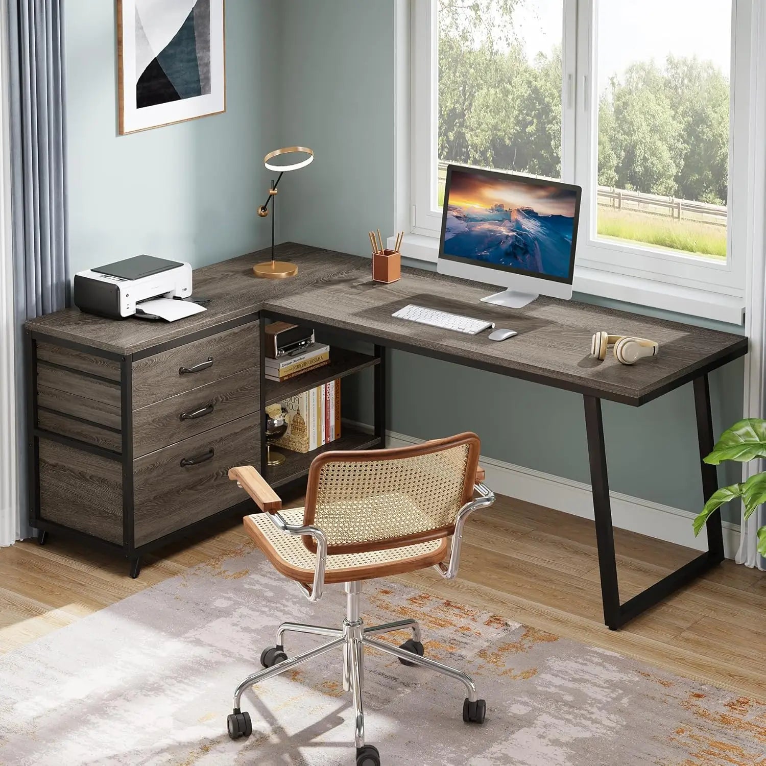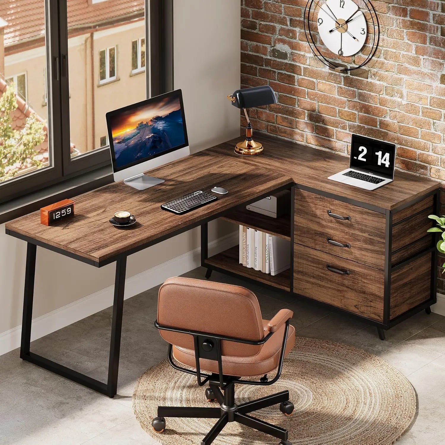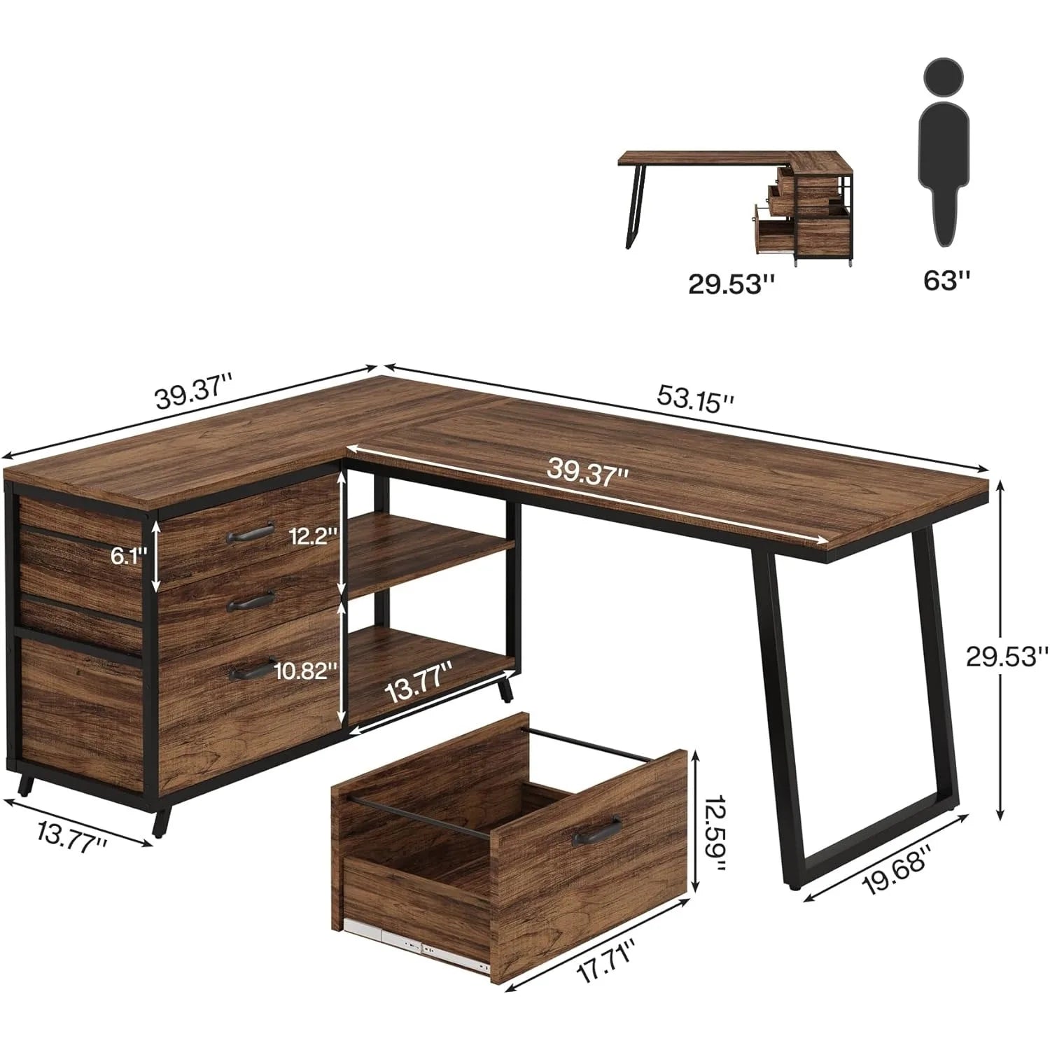 53″ L-Shaped Office Desk – Reversible Computer Desk with 3 File Drawers & 2 Storage Shelves for Home Office, Study, or Gaming Room